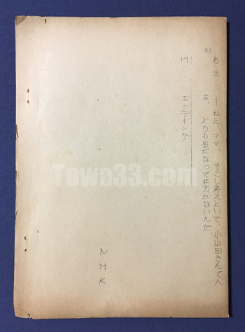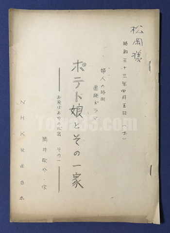 [tow768048]放送台本/脚本,昭和33年,ポテト娘とその一家/お染ばあやの秘密,その一 (放送台本/脚本,昭和33年,NHK)“婦人の時間”連続ドラマポテト娘とその一家/お染ばあやの秘密,その一作:筒井敬介/出演:江利チエミ,他 ≈B5,33頁/ ヤケ,小折,小ヤブレ,書込/ ¥1500