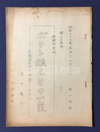 [tow768049]_放送台本/脚本,昭和33年,ポテト娘とその一家/お染ばあやの秘密,その二 (放送台本/脚本,昭和33年,NHK)“婦人の時間”連続放送劇ポテト娘とその一家/お染ばあやの秘密,その二作:筒井敬介/出演:江利チエミ,他 ≈B5,29頁/ ヤケ,茶シミ/ ¥1500