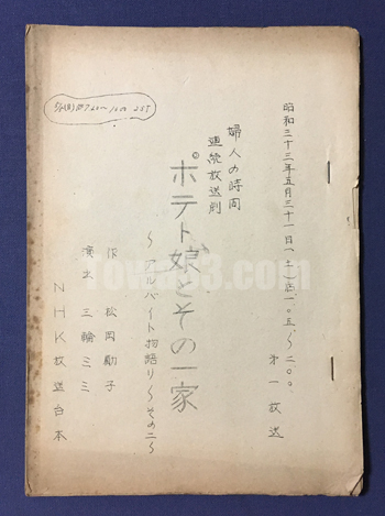 [tow768053]_放送台本/脚本,昭和33年,ポテト娘とその一家/アルバイト物語り,その二 (放送台本/脚本,昭和33年,NHK)“婦人の時間”連続放送劇ポテト娘とその一家/アルバイト物語り,その二作:松岡勵子/演出:三輪ミミ/出演:江利チエミ,他 ≈B5,36頁/ ヤケ,茶シミ,ヨゴレ,小折,小ヤブレ,書込/ ¥1500