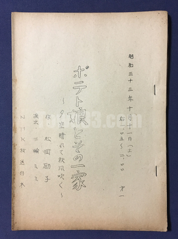 [tow768074]_放送台本/脚本,昭和33年,ポテト娘とその一家/夕空晴れて秋風吹く (放送台本/脚本,昭和33年,NHK)“婦人の時間”連続ドラマポテト娘とその一家/夕空晴れて秋風吹く作:松岡励子/演出:三輪ミミ/出演:江利チエミ,他 ≈B5,35頁/ ヤケ,茶シミ,ヨゴレ,折,小ヤブレ,書込/ ¥1500